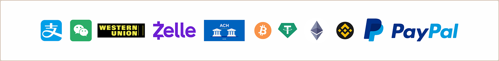 We provide diversified payment solutions to enhance customer experience, covering mainstream electronic payments and modern digital assets. Available transaction channels include international credit cards, cross-border wire transfers, Western Union international express remittances, Zelleinstant transfers, Xoom cross-border payment platforms, and are compatible with blockchain cryptoassets such as Bitcoin and USDT.